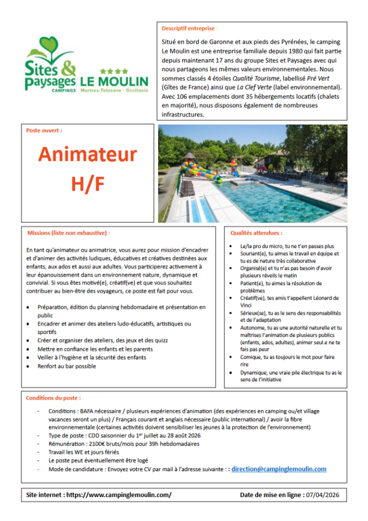 Pour postuler, envoyez votre CV et votre lettre de motivation par e-mail à direction@campinglemoulin.com